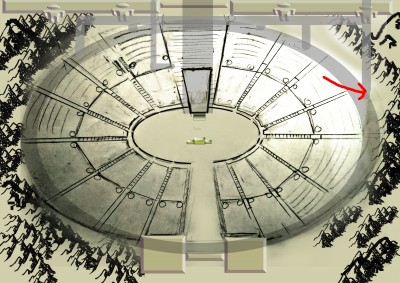 Próbując dojść do tego, którędy mogli podążyć, wysłali w tunele zwiadowców od Nut, z poleceniem wybadania, co dzieje się na arenie i gdzie skierowano jakiś pościg. Pierwszą informacją, jaka dotarła, było zawalenie stropu w jednym z korytarzy (rysunek). Korytarz był jednym z wielu technicznych przejść, łączących pałac świątynny z amfiteatrem pomijając zakazany dla zwykłych ludzi teren samej świątyni. Jakoś ostatecznie trzeba było obsłużyć gości, zapewnić jakieś jadło czy napitek, a przecież słudzy, niewolnicy czy metaya nie mogli wejść na najświętszą ziemię świątynną.